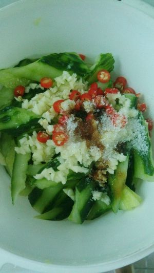 把辅料倒在黄瓜上,均匀搅拌就可以了。