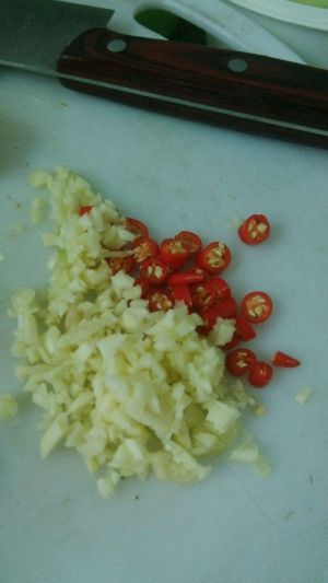 蒜瓣和小米辣切粒