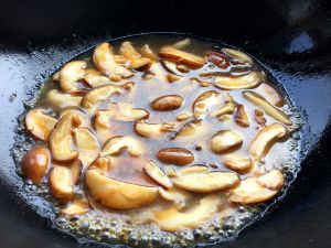 周锅中热油,油热加入葱姜蒜蚝油淋入半碗水,水热加入香菇至香菇熟