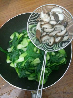 香菇洗净切片焯水沥干,油菜洗净中间切开焯水沥干