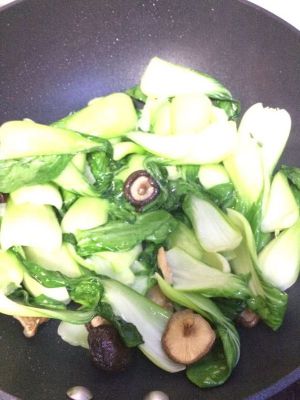 加入香菇翻炒,再倒入油菜,炒到油菜软的时候加入调料翻炒几下即可出锅。