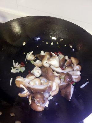 调中火放入葱和香菇条,煸炒至香菇有点收缩,注意葱不能焦。