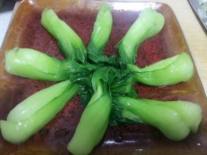 烫好的油菜摆盘备用