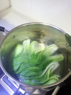 水中放少许盐、香油,放入油菜烫一下。