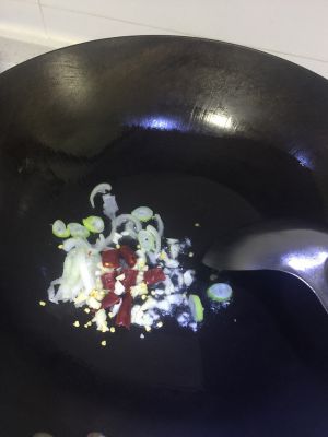 锅中放油,葱、蒜、干辣椒炸锅