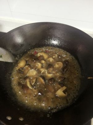 刚才泡香菇的水,取上层无杂质的部分,加入适量的淀粉、糖;调匀,倒入锅中勾薄芡;
