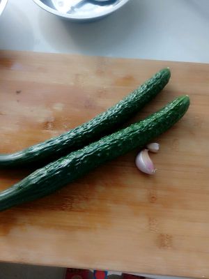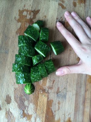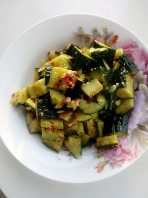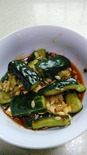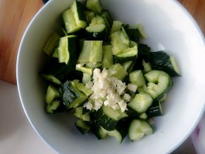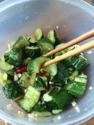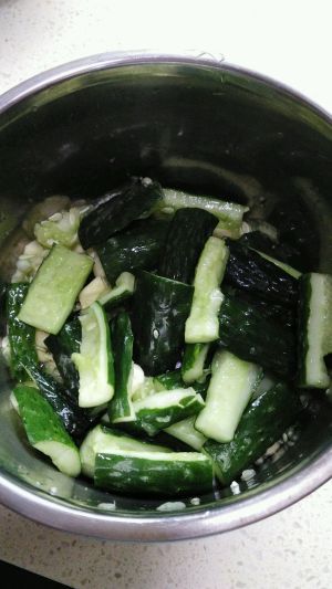 黄瓜洗净,切成喜欢的长度,用刀拍扁。拍时注意黄瓜籽会飞溅,用手挡着点哈!大蒜拍扁,和黄瓜一起放在一个较深的盆里,放适量盐腌一腌,时不时拿起盆抛一抛,让所有黄瓜都粘上盐。五分钟后将腌出来的水倒掉,这样黄瓜会更爽脆。