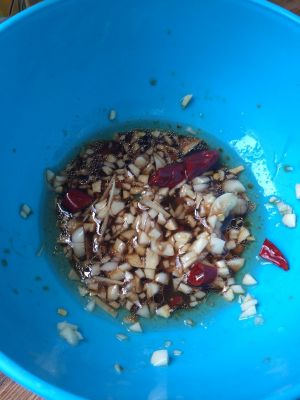 蒜蓉干辣椒切好,倒入香油,生抽,调匀。ps.酱汁可根据个人喜好自由发挥。