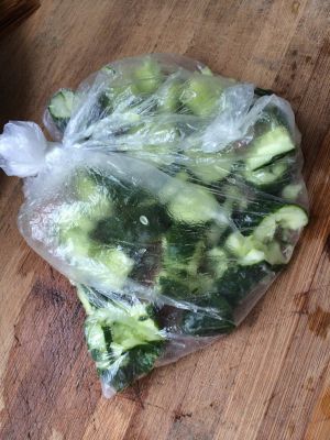 将黄瓜装入保鲜袋,用刀背用力拍碎,但是也不要太碎噢,好入味即可