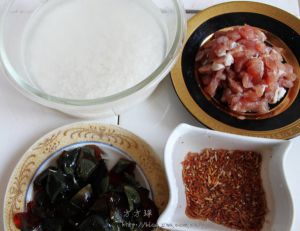 备材料,皮蛋,瘦肉,大米。不好意思,没有来得及拍图片,