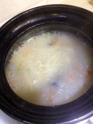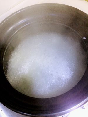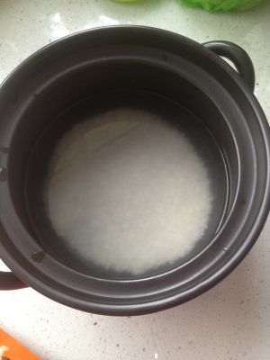 锅内加水烧开后倒入大米(我用的是砂锅也可以用电饭锅哦)开锅后盖上盖子转小火,加热30分钟。中途用勺子搅拌可以防止粘锅底 和更好的出米油。