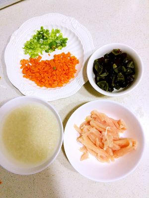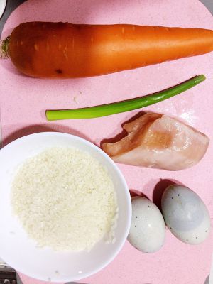 米加水泡十分钟 鸡胸肉切丝 葱和胡萝卜切丁。皮蛋去皮切成小块(切皮蛋是刀用水冲下 这样不会粘刀)