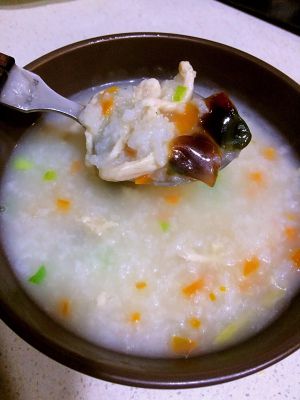 加入切好的皮蛋,姜丝,盐,肉丝,少许油,用勺子按一个方向搅拌约十分钟,出锅加葱花,完成
