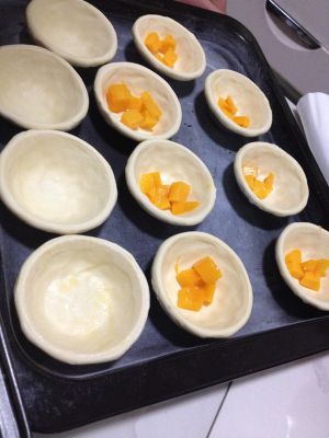 蛋挞皮备好,室温软化,黄桃芒果切块放入备好。