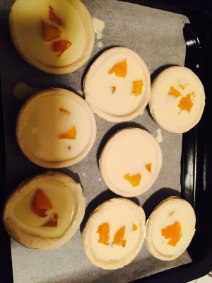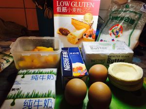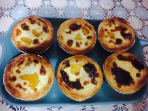 铺上油纸,在蛋挞皮中倒入挞液,最后放上芒果。烤箱预热五分钟,上下层各220度烘烤二十五分钟