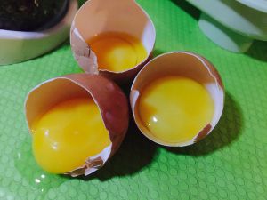 去三枚鸡蛋蛋黄加入锅中,边加边搅拌,防止蛋黄凝固