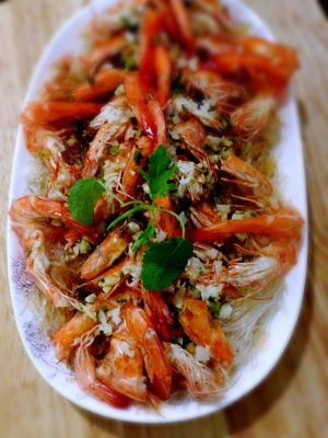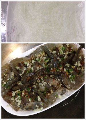 粉丝热水烫开放盘里铺好,处理好的虾摆上
