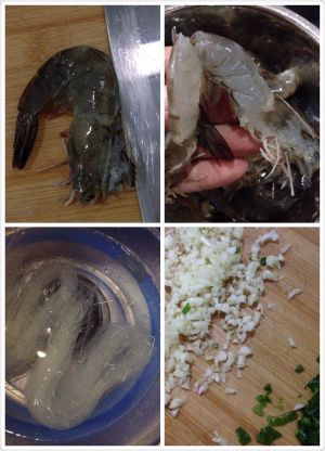 虾买来先放冷冻把它冻硬,拿出来随便怎么处理都容易的多!先去须和嘴巴上的刺,再从背上切两半挑出虾线!粉丝泡软,蒜蓉葱花剁碎一点!