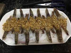 盘子底部摆上泡软的粉丝,虾在盘中依次排开摆盘,将蒜丁倒在虾背上,盆子中倒入调味ok的酱油+麻油+味精,加些许水莫过粉丝。