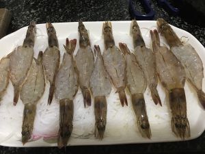 洗净虾,开背,具体方法:用一把剪刀,身体和头,还有身体和尾巴衔接处分别剪2/3深,再从尾巴的刀口中间沿着背部一直剪到头部的刀口,也是剪2/3深,刀口总体程“工”字型,随后剔除虾线
