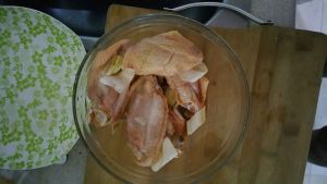 把鸡翅洗干净,最好在表面划几下入味,放在碗里味上,需要老抽(酱油)料酒(白酒)葱段,姜片,胡椒粉,一起跟鸡翅味上(15分钟)注意翻动均匀