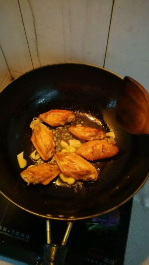 倒少许油。把葱姜八角放进去炝出香味以后鸡翅倒进去稍微翻炒一会,可乐倒进去,再到一点酱油,盖上锅盖大火10分钟,