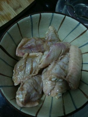 鸡翅洗干净切两刀好入味,碗里放姜,米酒,盐腌制半小时