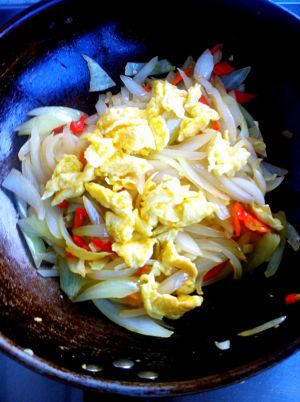 锅入少油,油热后,倒入鸡蛋,炒散,盛起。锅入油,热后倒入洋葱,大火翻炒。将炒熟的鸡蛋倒入,一起翻炒均匀。