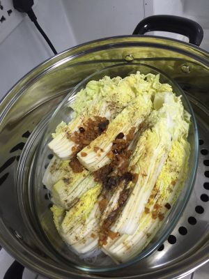 娃娃菜洗干净 放蒸锅 蒸 可放一点 黑胡椒 汤汁可以多一些