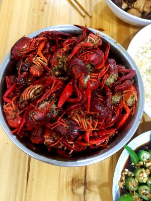 锅内到适量的油烧红,倒入准备好的龙虾爆炒,再加入龙虾料,葱、姜、蒜、辣椒干再炒一会,加入一点水!待汁收干后就可以起锅啦!