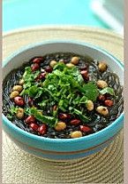 沥干水份放入调料碗中,表面放炸酥的花生和黄豆,切碎的香菜,葱,吃时拌匀即可