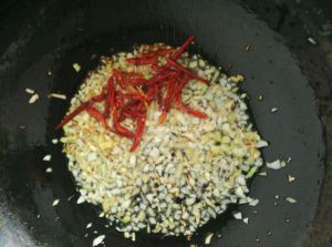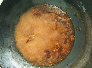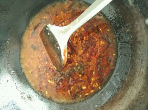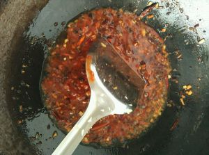 冷锅热油,加入姜蒜末、少量的豆瓣酱炒香、再加入肉末炒香,然后再调入辣椒粉、花椒粉、适量的汤、酱油、鸡精、醋做成卤。