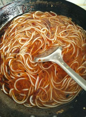 把泡好的红薯粉条在开水中烫后捞出,加入炒好的卤撒上葱花、酥黄豆、花生即可。
