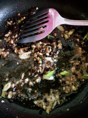 锅中放油,倒入蒜末,豆豉和一半的葱白炒香,加入生抽,糖,蚝油,翻炒十几秒后汁稠关火。