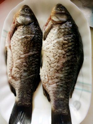 新鲜的鲫鱼收拾干净后,每面划上三刀,用盐与料酒腌上15分钟。