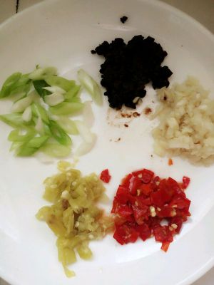 蒜头拍一拍,豆豉冲洗,辣椒切小段。