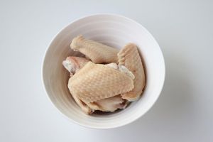 翅中温水洗净,用餐纸擦干,在正面和背面各斜着划三刀,跳进碗里待腌。