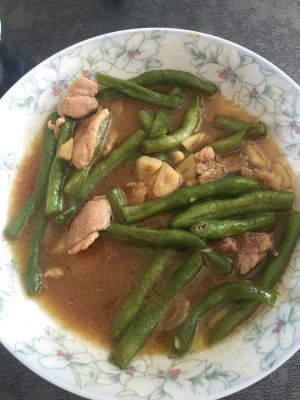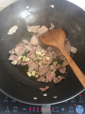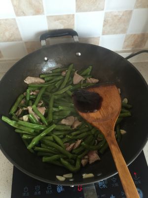 肉片变色后放入蒜片,炒出香味放入豆角翻炒