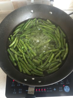 将四季豆清洗干净之后,掐去老筋,然后用手掰成小段,再起锅加入宽油,油温7成热时,将四季豆倒入锅中,炸熟至起虎皮,然后捞出,放到漏勺里面控油。