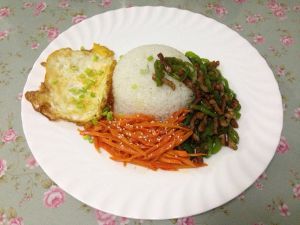 此时米饭已蒸好,盛出一碗米饭,青椒肉丝、胡萝卜丝、鸡蛋摆盘,开吃!