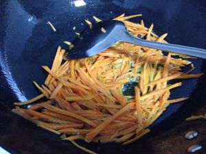 胡萝卜、青椒、五花肉全部切成丝,先炒胡萝卜丝,炒好盛出备用。