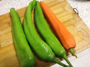 用淘米水把青椒和胡萝卜洗干净。
