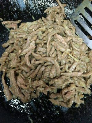 放入腌好的牛肉丝 (炒牛肉丝的时候注意火候,中火就可以了,火太大就不滑嫩了 会硬)