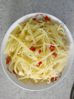 土豆丝切好后放入水中讲淀粉冲掉,再加少许白醋后待用