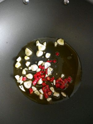 热锅,加入适量食用油,将蒜蓉、干红辣椒放入爆香。(没有干红辣椒的话换成小米椒也是可以的)