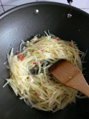 油烧热后放入蒜头和辣椒。煸出香味后倒入土豆丝,