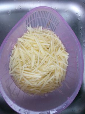 把土豆去皮切成丝。如果刀工不是很好。可以买刮丝的那个东西。把土豆去皮然后刮成丝。如果喜欢吃脆点的朋友,可以把土豆丝多泡一会。这样把淀粉泡掉。就不会这么面了。
