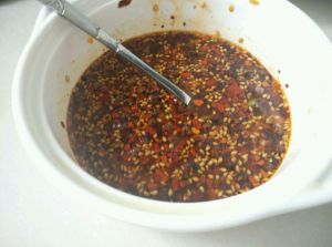 加入两勺醋 、两勺酱油 、两勺辣椒油 、一勺熟的白芝麻,两勺麻椒油 、搅拌均匀