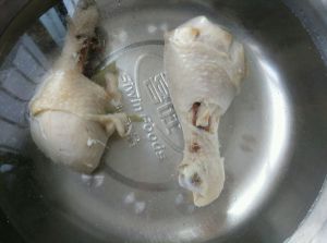 准备一盆冷水,鸡腿煮好迅速捞出放入冷水中。