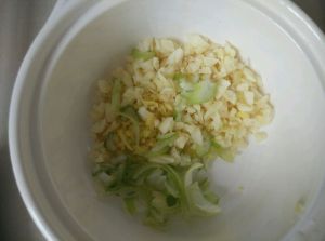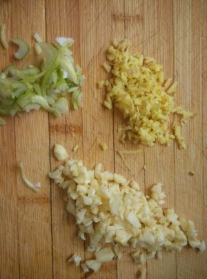 准备好调酱汁的小葱、姜、蒜、辣椒和香菜。